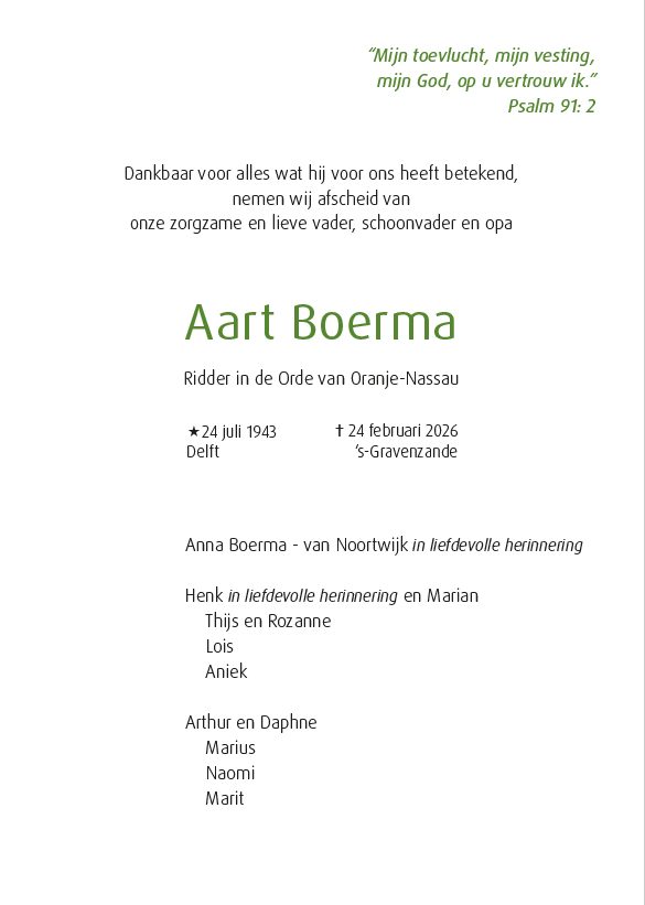 Vandaag, vrijdag 27 februari 2026, ontvingen wij het bericht dat dinsdag 24 februari jl. op 82 jarige leeftijd is overleden ons lid en voormalig aanvoerder van het eerste elftal, Aart Boerma.